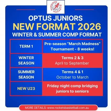 From March 2026, South West Metro Pirates are moving the junior competition (Optus Juniors) to a clearer Winter / Summer model. Runcorn Rockets will align all our junior teams with this structure.